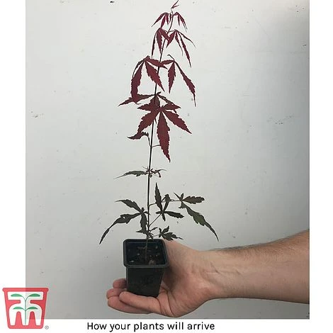 A classic Japanese Maple producing gorgeous, purple-red foliage that colours to brilliant, fiery red in autumn. This slow growing tree has an attractive open habit that forms a broad canopy and creates a dramatic silhouette in borders. Acer palmatum ‘Atropurpureum’ is an ideal small tree for a sheltered position and makes an excellent specimen for large patio containers. Height and spread: Up to 4m (13′).