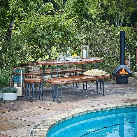 Those looking to revamp their outdoor dining space should look no further than our exquisite Borough furniture set. The unique contemporary design is made with coated FSC Certified acacia hardwood, and its robust frames are finished with a kiln-baked protective powder to protect against scratching or rusting. The Borough design set provides a stunning and practical dining setting.