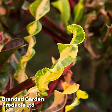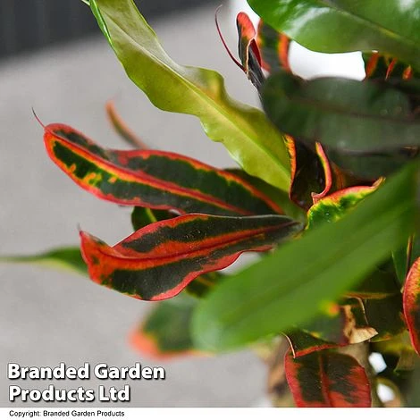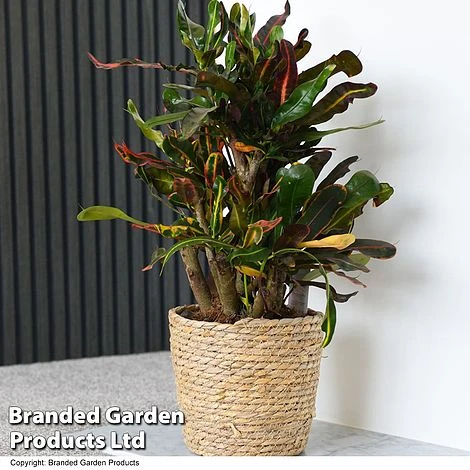 Codiaeum variegatum ‘Mammy’ is a dazzling houseplant boasting thick, glossy, wavy-edged leaves in green and burgundy, each beautifully splashed and streaked with yellow, orange or pink. The upright leaves curl and twist dramatically as they grow to add to the year-round interest. Sure to become the centre of attention in any room, Croton ‘Mammy’ is a firework display in plant form! Height: 100cm (39in). Spread: 60cm (24in).