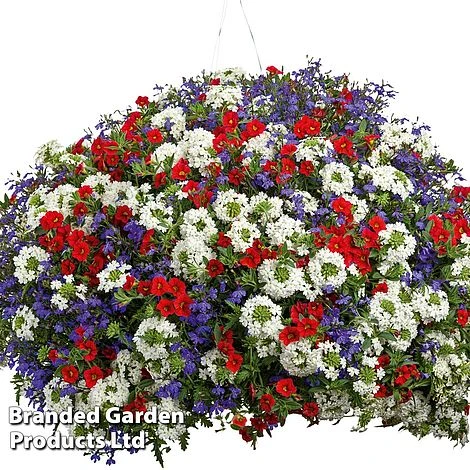 Easily create flawless hanging baskets or container displays with our hand-picked Pride of Britain Colour-themed Collection, producing a joyful profusion of blooms in red, white and blue. This vibrant annual bedding collection will stand up to bad weather and will flower from June to October, providing great impact for very little effort! Bees love it just as much as we do. The Pride of Britain Collection comprises red calibrachoas, white verbena and blue lobelia. These half-hardy annuals (varieties may differ from those pictured) will reach a height of up to 30cm (12in).