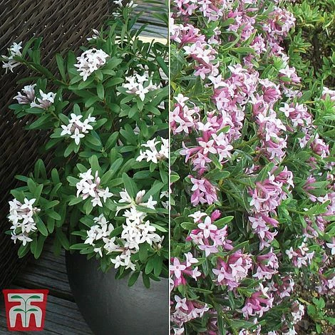 With Daphne ‘Pink Fragrance’. Beautiful clusters of pink flowers bloom over an exceptionally long period from March right through to October. This lovely daphne variety will keep foliage all year round. Compact and slow-growing, ‘Pink Fragrance’ will thrive in a container in free-draining, fertile soil in a sunny spot – make the most of its lovely fragrance and position one either side of a door so that the perfume wafts in.