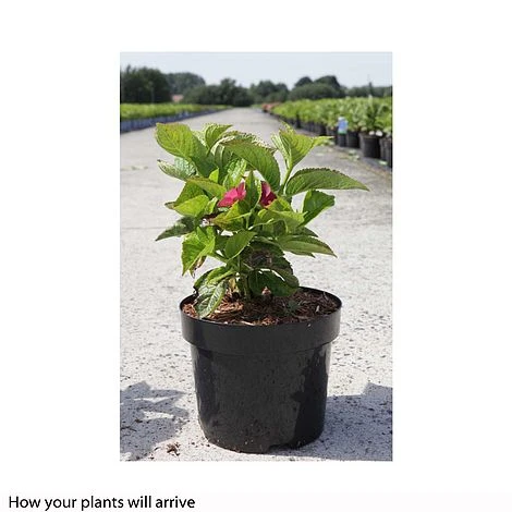 Hydrangea macrophylla ‘Rotschwanz’ has almost two-tone flowers over the summer months, deep red, cross shaped flowers encircle the pale coloured pink of the lacecap blooms giving it its striking appearance. In more acid soils the flower colour will become a more mauve hue, but equally as attractive! Autumn will turn the leaves shades of red before they fall giving this hard deciduous shrub a true blaze of colour in your garden. Height: 150cm (59″). Spread: 150cm (59″).