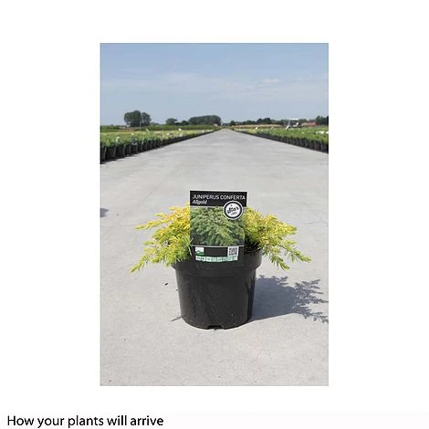 An attractive Shore Juniper with needle-like, evergreen foliage in a soft shade of gold. New spring growth is the brightest, although it holds its colour well throughout the year. Juniperus conferta ‘Allgold’ is a low-growing, prostrate conifer that forms a dense carpet with maturity. This useful, low maintenance Juniper is ideal for softening the edges of borders and rockeries, or creating resilient, evergreen groundcover. Height: 40cm (16″). Spread: 2m (6′,5″).