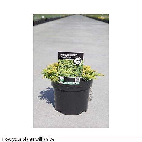 If your garden lacks colour and structure in winter then try Juniperus horizontalis ‘Golden Carpet’. This low growing creeping Juniper creates a bright splash of golden foliage that will cheer the dullest days. This prostrate evergreen shrub makes excellent ground cover and is ideal for softening the edges of borders and conifer beds. Juniperus horizontalis ‘Golden Carpet’ has been recognised by the RHS with an Award of Garden Merit. Height: 30cm (12″). Spread: 2m (6′,5″).