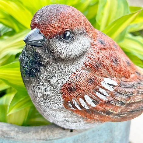 Wonderful Sparrow bird garden ornament made from hand finished polyresin. This fat Sparrow will look great hide amongst plants in the garden and can stay outside all year round. Bird size 20cm long, 12cm tall, 10cm wide.