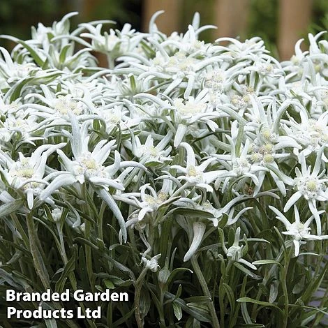 Better known as Eidelweiss, Leontopodium alpinum is an utterly charming hardy alpine perennial. Distinctively soft and felt-like, the silvery star-shaped blooms make a striking display above the neat clump of narrow, greyish foliage. This alpine favourite thrives on excellent drainage, particularly during the winter months, so is perfect for growing in containers, rockeries and on very light soils or scree. The unusual-looking blooms of Eidelweiss make lovely dried flowers too. Height: 25cm (10″). Spread: 20cm (8″).