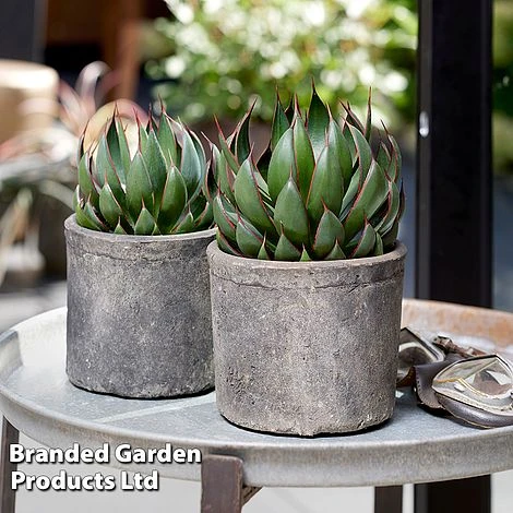 Boasting the architectural qualities of an Agave, but much faster growing, Mangave ‘Blazing Saddles’ makes a striking succulent specimen for a conservatory or patio pot. This indoor/outdoor plant represents a revolution in plant breeding. Mangave is a hybrid cross between an Agave and Manfreda, hardier than an Agave, faster-growing, lacking those vicious spikes and with a fuller, tighter rosette like an Echeveria. Drought tolerant, it will require little watering and can be grown outside all year in areas with very mild winters such as coastal and city gardens, but like most tender perennials, will otherwise need to be brought into a frost-free greenhouse or conservatory over winter. Use it as a striking focal specimen on its own or combine it with other succulents and tropical bedding for a really wow-factor display. Height: 20cm (8in). Spread: 35cm (14in).