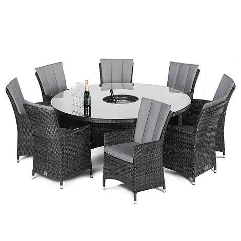 This 8 Seater Dining Set is a wonderful piece of garden furniture, perfect for entertaining and socialising with friends and family in the summer months. Dining Set has been crafted using hand woven flat rattan weave and sturdy powder coated aluminium frame for a rust free design to provide by years of use. This Round Set comes complete with 8 high back dining chairs with comfortable seat and back cushions, a circular dining table with 8mm tempered safety glass top, an integrated ice bucket and practical Lazy Susan.