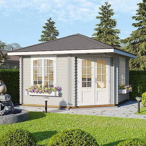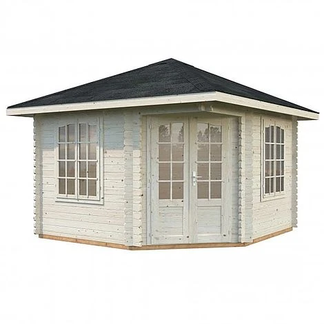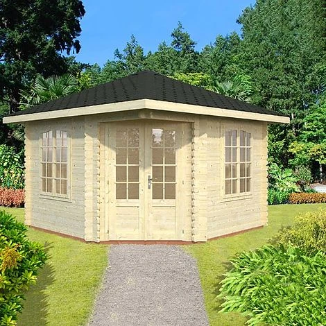 Melanie Corner Cabin is a superb value Double Glazed Corner Log Cabin with 5 sides. This Summer House is a large Corner Log Cabin featuring 44mm wall boards. It is an attractive addition to the garden and could be used as a year round garden office or simply as extra outdoor space to entertain or relax throughout the year.