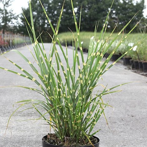 Miscanthus sinesis ‘Strictus’ is a deciduous perennial grass that makes a fine ornamental feature in borders, adding height, colour and texture to planting schemes. Slender leaves with a spiky, upright habit are intersected by prominent gold bands. This clump forming grass produces tall stems topped with silvery flower plumes from late summer, which make a fabulous feature if left in place throughout the winter months. Awarded an RHS AGM, Miscanthus sinesis ‘Strictus’ is reliable and easy to grow. Height: 2m (6’). Spread: 60cm (2’).