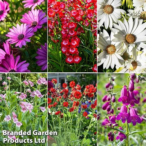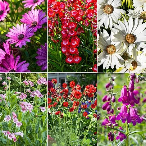 Your collection will consist of 6 plug plants of each of the following varieties: Geum ‘Samba Sunset’, Osteospermum ‘Tresco Purple’, Osteospermum ‘Snow Pixie’, Penstemon ‘Blackberry’, Penstemon ‘Sweet Cherry’ and Penstemon ‘Strawberries & Cream’ .