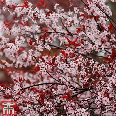 Prunus x cistena forms an upright, bushy, slow growing shrub which also makes a good low maintenance, deciduous hedge. Alternatively, grow as a specimen shrub in a container on the patio or as a focal point in the garden. Its single, pale pink, fragrant flowers appear in spring, after the young leaves have appeared. The colourful foliage of this Purple-leaf Sand Cherry is red whilst young, turning a more intense red-purple through the summer months and becoming more bronzed in autumn. Occasionally a few cherry sized, blackish-purple fruits are produced in July, which can be difficult to see as hidden by the red-purple leaves. Height and spread: 1.5m (5′).