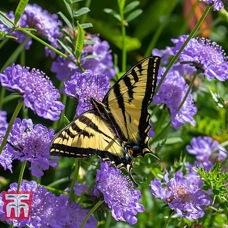 An abundance of blue pincushion scabious flowers will attract bees and butterflies throughout summer. The tall, wiry stems can also be cut to create a pretty display indoors. Scabiosa ‘Blue Jeans’ blends well among cottage garden borders, where they look particularly effective planted in large drifts. Height and spread: 45cm (18″).