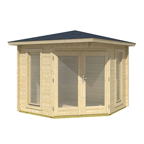 A perfect, low ridge garden building designed to sit in the corner of the garden. With its low, unobtrusive roof lines and its 40mm walls along with double glazing this building is discreet yet quietly impressive. This style of corner log cabin is one of the most popular on the market as it makes amazingly efficient use of space whilst still offering a very useful and practical internal area. Whether you are looking for a small garden hobby room, an extension to your living space or simply the perfect summer house