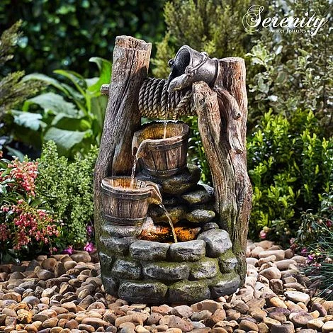 This rustic water feature is made from durable polyresin, and has three pouring jugs and a wishing well. Once filled with water, plug the water feature into a mains socket and the water will start trickling continuously from the top jug, down to the wishing well. The internal pump, pushes the water back up to the top. LED lights illuminate the feature at night. It is ideal for patios and decking, as well as inside conservatories.