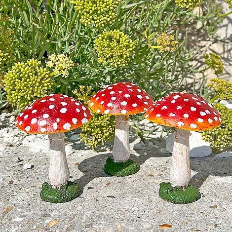 This wonderful set of three garden mushrooms are ideal to dot around the garden or add, or to start a fairy garden patch. Each is hand painted and made from weather resistant resin. Each mushroom is 10cm tall, 7cm wide.