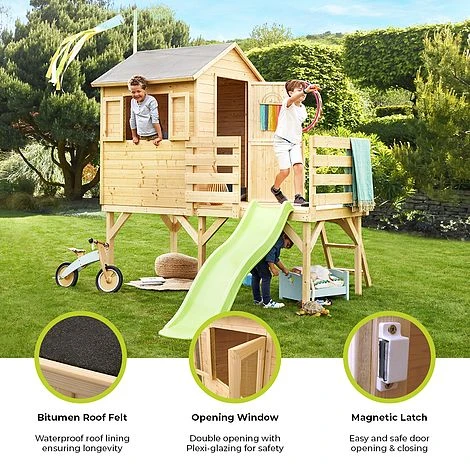 Josephine Playhouse will give your kids the best outdoor experience possible! Children can play on the terrace and slide of this traditional design raised playhouse. Kids will have a ton of fun in their garden and create treasured childhood memories for the years to come. This playhouse is one for every adventurer.