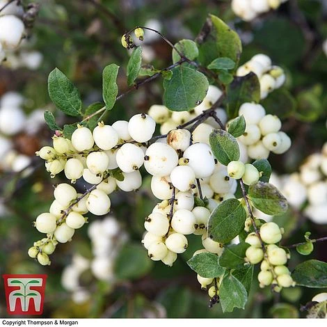 A compact plant which produces a mass of small white flowers in summer which go on to produce white fleshy berries in autumn (harmful if eaten). A non fussy shrub, Symphoricarpos ‘Magical Galaxy’ will thrive on most soils and although prefers to be in sun, it will tolerate part shade. The deciduous foliage is a yellow tinted green colour, which goes beautifully with its white fruits. Height & Spread: 80cm (32″).