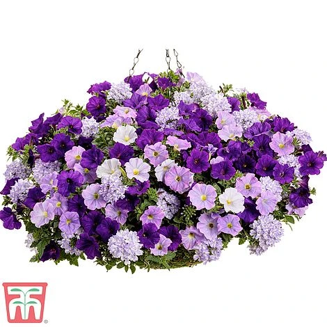 Collection contains: Petunia ‘Veranda Dark Blue’. Petunia ‘Veranda Sky Blue’ and Verbena ‘Voodoo Lavender Star’. Height: 25cm (10″). Spread: 45cm (18″).