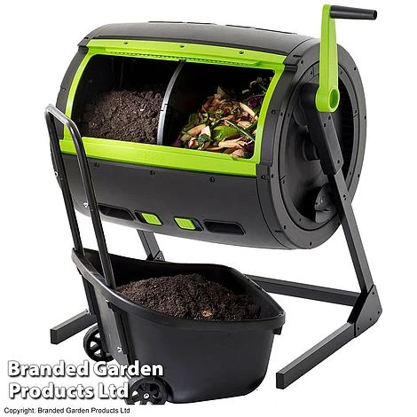 Made from 90% recycled, UV-resistant plastic, the sturdy reinforced drum includes air vents to stimulate aerobic decomposition, integral churners to mix the compost, a handle for easy turning of the barrel, a geared ratchet to lock rotation in any position, and large sliding doors for adding material and collecting compost effortlessly. The drum is mounted on a strong powder-coated galvanised steel frame.