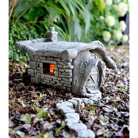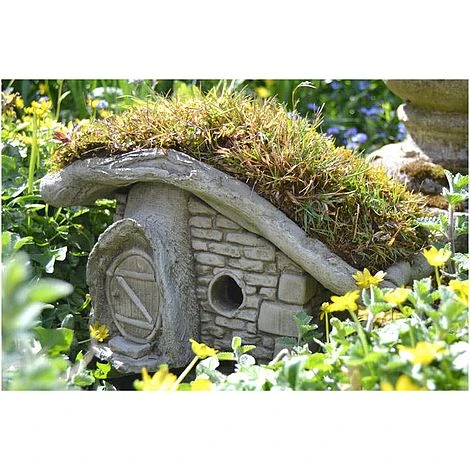 Turf Lodge boasts a detailed exterior, including its brick laid base, tree-like door frame and tree branches which make up the edging for the roof. And the really exciting thing about the lodge is that it allows you, if you wish, to plant a real living roof! This allows the piece to be brought back to nature and fits in with any garden (please note the turf is to be planted by yourself, the picture is an example). The roof on Turf Lodge lifts off to expose the detail that has been crafted inside. Peek inside at the tiny fairy-sized books on the bookshelf and the fireplace. Supplied with two sets of stepping stones, to guide fairies to the door! 38 x 33 x 22.5cm.