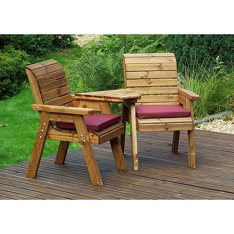 Twin Companion Set Angled: The Angled Twin Companion Set is an ideal bench for people who seek a calming garden experience and are attracted to the natural beauty of wood. The bench boasts an interesting design of two armchairs and a shared middle table, all in one piece. Solitude is good, company’s even better and three’s a crowd! The Twin Companion Set is made of Scandinavian Redwood which is a beautiful and durable wood resistant to decay and disease. It is fully treated for your peace of mind. The bench’s generously sized and sturdy seats come with an optional set of cushions in any one of three attractive colours. The table is very handy as you can rest several things there like your glasses, your drink, a snack, or a book. Invite your loved one to sit with you and stargaze together or talk about life amid your lovely garden. No matter the moment, the Twin Companion Set is sure to enhance your outdoor space with its ingenious design and its rustic charm of natural wood.Please note that the optional set of cushions comes with one fitted cover.