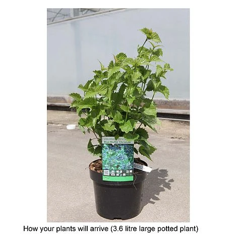 Viburnum dentatum ‘Blue Muffin Christom’ is hardy deciduous shrub that is ideal for growing in a variety of situations. The dense green foliage forms a naturally rounded shape over time, which in late spring becomes smothered in clusters of tiny white flowers, making it a stunning specimen plant. The flowers will later develop into very pretty blue berries which are greatly appreciated by birds in the autumn. Minimal maintenance is needed on this variety, an annual pruning after flowering if you desire a particular shape, otherwise it will happily grow normally without being clipped. Height: 150cm (59″). Spread: 120cm (47″).