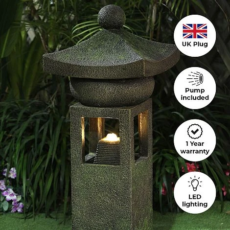 This majestic pagoda water feature is a stunning piece, perfect for adding a Victorian twist to your garden. A gentle flowing stream of water emerges inside, flowing down a rippled rock face, creating a pleasing effect. The water is lit up by a gentle, warming LED light that adds to the magical, mystical aura of this piece. Finally, ‘moss’ adorns this pagoda, creating authenticity with an aged appearance.This is a self contained system, meaning setup is extremely easy and the fountain does not need to be connected to a water source, just topped up with water. All equipment needed for your own spectacular display