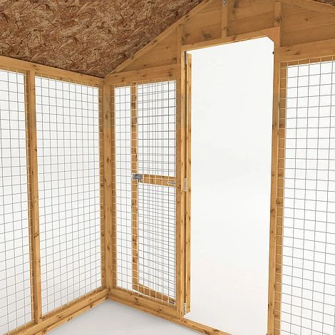 The walls are manufactured using 12mm interlocking Shiplap tongue and groove boards; this provides a solid structure, guaranteed to offer years of reliable use. The floor is manufactured using smooth and strong interlocking boards, for a premium, high grade finish. A solid sheet board roof covers the entire building, and is finished with high quality mineral felt for long-lasting, weatherproof protection. The mesh access door comes complete with a high quality padbolt as well as turn buttons for added security.