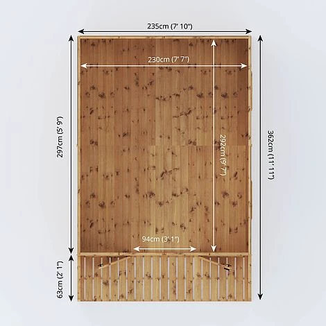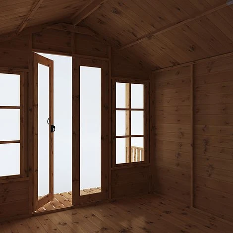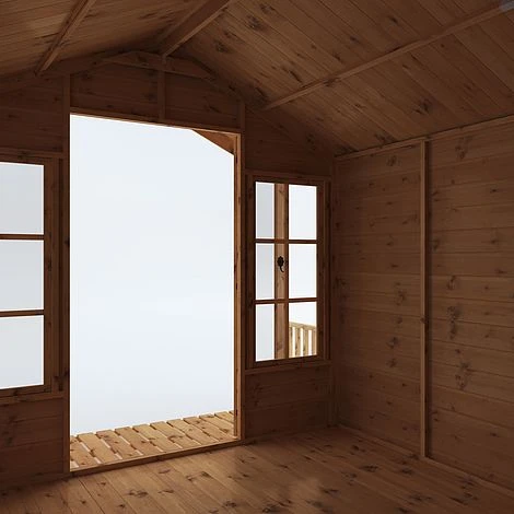 Made using 12mm Shiplap, also known as tongue & groove, the walls of this garden room are designed to keep water and draughts firmly at bay, while providing a robust and long lasting construction. With fully glazed double doors opening out onto the sheltered veranda, this summerhouse features a great place for enjoying the summer weather while being shaded by the sun. The vast interior is spacious with plenty of room for large furniture while four large windows allow the building to flood with light, creating a bright and welcoming space.