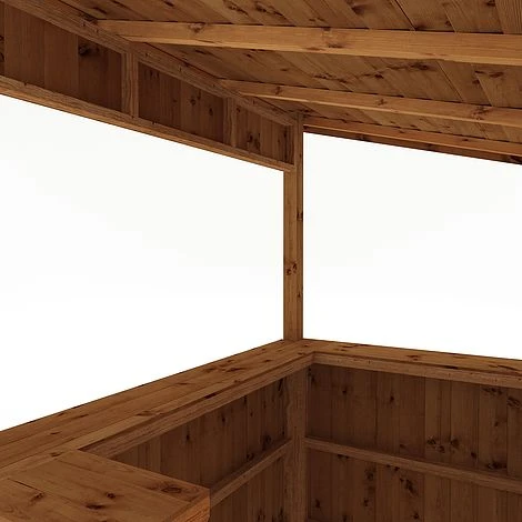 We manufacture this outdoor bar here in the UK, using pressure treated 12mm tongue and groove boards with a thick, 44mm x 44mm frame. Not only does that make for a robust, strong and long-lasting build, it looks great too! The roof is formed using overlapping timber boards that are nailed to an internal frame. Boasting a contemporary pent roof design, rainwater will simply run off the back of the building, to keep the inside of the bar dry and to avoid any water build-ups.