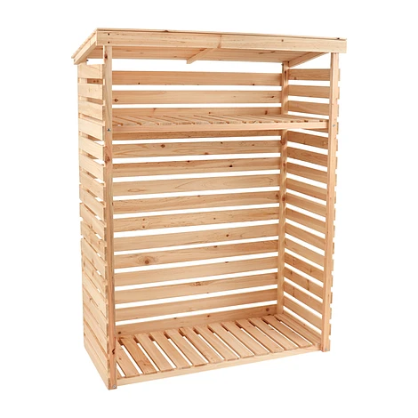 Large capacity wooden log and firewood store which is ideal to keep wood neat, tidy and dry. Practically designed with a raised floor and sloping roof which will help keep your wood dry. The practical storage shelf and slatted sides for ventilation make it the perfect accessory for storing your logs and firewood.